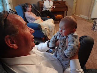 Right after church, instead of going downstairs with the wild and crazy kids, Lukas grabbed his "Decke" and crawled up into Grampy's lap.